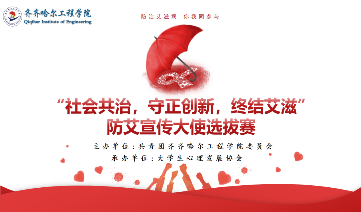 12月1日,在第38个“世界艾滋病日”来临之际,学校团委为普及艾滋病预防知识、增强青年学生自我保护意识,在二号教学区2508会议室举办第二届防艾宣传大使选拔赛。本次比赛以“社会共治,守正创新,终结艾滋”为主题,特邀齐齐哈尔市疾病预防控制中心艾滋病性病防治科王卓、龙沙区疾病预防控制中心党委副书记张明佳、艾滋病性病防治科科长王力刚、校团委指导教师张云惠、大学生心理发展协会指导教师艾涵塽及各二级学院团委书记共...