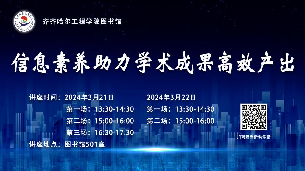 3月21日至22日,学校图书馆在501报告厅举办《信息素养助力学术成果高效产出》知识讲座,讲座由共青团齐齐哈尔工程学院委员会协办、中国知网承办,共计5场,由中国知网资深培训讲师主讲,参与讲座人数达1355人次。本次讲座旨在为更好地帮助学生了解中国知网功能,熟悉文献检索方式,学习深度阅读文献方法,培养学生信息素养能力,从而保障科研学术成果高效产出。学生通过“到梦空间”第二课堂平台报名预约讲座,可参加3月21日...