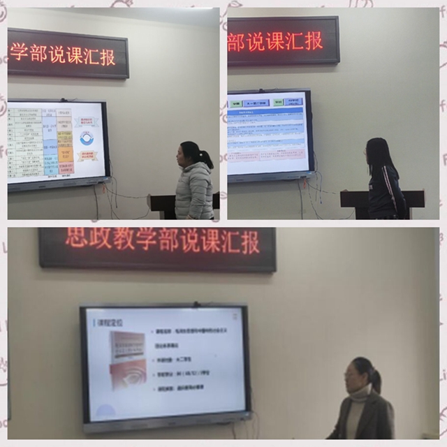 1月25日下午,思政教学部组织部门全体教师进行说课活动,旨在进一步优化课程教学组织形式,为新学期开课做好准备,思政教学部邵奇副主任主持本次说课活动。 部门教师按照课程定位、设计、实施、评价四要素展开...