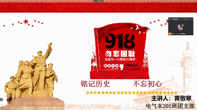 9月18日晚,电气201班团支部召集班内全体成员,通过腾讯会议召开勿忘国耻九一八线上主题团会。由团支书黄敬寒主持。 本次团会正值9月18日,以纪念九一八事变90周年为主题。黄敬寒通过腾讯会议线上直播PPT的方式,叙...