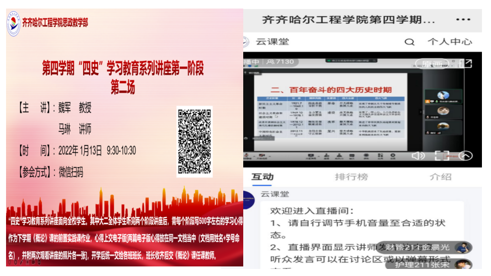 1月13日,思政教学部根据《齐齐哈尔工程学院2021—2022学年度第四学期实施方案》安排,面向学校全体学生开展了线上“四史”学习教育系列讲座(第一阶段),在线观看人数达到7000余人。 本次讲座由思政教学部魏军、马...