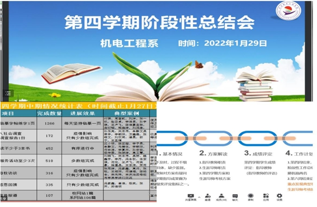 1月29日20时机电系利用腾讯会议平台组织召开第四学期阶段总结会,机电工程系主任郭磊、学生工作副主任于晓玲、全体专业长、指导教师和全体辅导员参加。 会上学生工作副主任于晓玲,总结了前一阶段第四学期进展情况,...