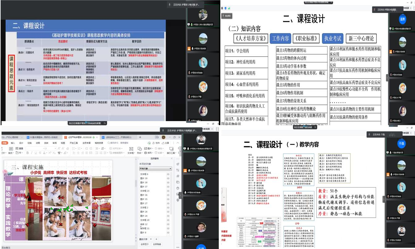 2月20日,护理学专业采用腾讯会议形式进行新学期教师说课活动, 10位教师参加,专业负责人张林琳主持。 教师们根据新学期任课情况,从课程定位、课程设计、课程实施、课程评价四方面出发,分别进行阐述。重点讲述专...