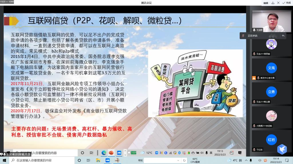 3月24日晚, 第二期易湖金融科技论坛在云端开讲,本期论坛特邀南京理工大学工商管理硕士王吴彬主讲,我校管理工程系互联网金融专业、信息工程系数据科学与大数据专业的师生100余人线上参会。专业长李文禹主持。 王吴...