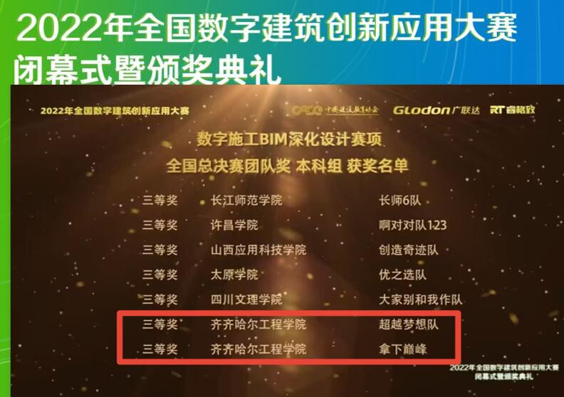 11月26日,2022年全国数字建筑创新应用大赛闭幕式暨颁奖典礼在线上举办。闭幕式公布了全国总决赛团队奖获奖名单,我校建筑工程系土木工程专业共有4个团队荣获三等奖,分别是美少女队、超越梦想队、拿下巅峰队和勇往直...