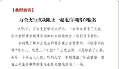 近日,我校管理工程系财务管理专业大四学生李超越在河北省张家口中国银行万全支行就职期间,成功阻止一起电信网络诈骗。此事被该行列为典型案例,并受到表彰。 2月9日,在万全支行营业大厅内,客户王先生向大堂经理李...