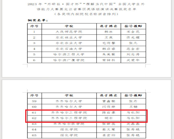 近日,2023年“外研社·国才杯”“理解当代中国”全国大学生外语能力大赛黑龙江省赛区英语组决赛获奖名单结果揭晓。我校土木工程221班陈自豪、工程管理221班胡东荣获黑龙江省赛区英语组演讲决赛铜奖;机器人231班潘嵘耀、风景221班刘小银和机械221班苏金慧荣获省赛区英语组写作决赛铜奖;护理学221班张若彤、工管211班章海滨和电气223班朱子彤荣获省赛区英语组阅读决赛铜奖。“外研社·国才杯”为教育部56项国赛中第17项(外研社...
