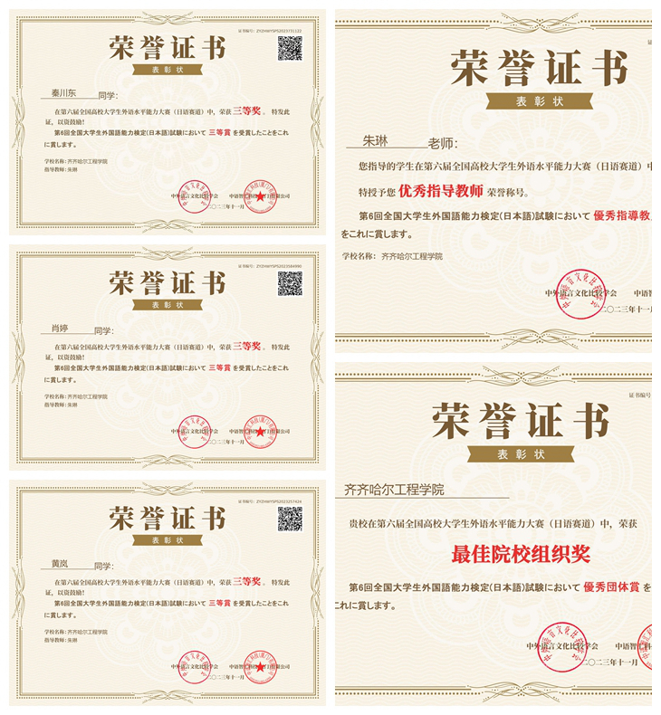 近日,第六届全国高校大学生外语水平能力大赛成绩揭晓,管理工程系英语专业的骆权涛同学在日语赛道获得特等奖;彭季秋和唐章磊同学获得二等奖;刘春雨等八名学生以及信息工程系计科231班黄岚、计科232班秦川东、计科233班肖婷获得三等奖;我校荣获“最佳院校组织奖”;朱琳老师荣获“优秀指导教师称号”。本次大赛由中外语言文化比较学会主办,秉持“以赛促教、以赛促学、以赛促练”的办赛理念,共设置英语、日语两个赛道,全...