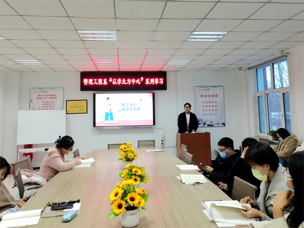 为进一步贯彻落实党建引领、三全育人理念,深化教师教学水平和管理经验,近日,管理工程系党总支组织开展“以学生为中心”系列学习活动。互联网金融专业负责人沈斯文领学。沈斯文教师结合学校办学特色与办学理念,对“新三中心”概念与历史的相关内容进行梳理与总结,并从什么是“新三中心”、“新三中心”的理论基础、“昨天、今天、明天”三方面进行了介绍。此次学习,管理工程系的教师不仅深入了解“新三中心”的概念和理...