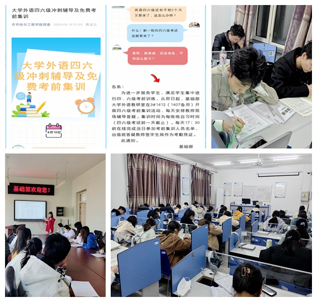 近日,基础部大学外语教研室在校团委的协助下,开展系列考试集训活动,以动员学生投入英语学习热潮中,从而促进学校整体学风建设。活动分为全国大学生英语竞赛考前辅导和2024年6月大学英语四级考试学生集训两个部分,为期两周的全国大学生英语竞赛考前辅导共安排10节课,教师为学生梳理考点,总结答题技巧,模拟训练历年真题,帮助学生短期内提升英语应试能力。针对英语四级考试集训,自本学期4月9日起,每晚学生采取自愿报名...