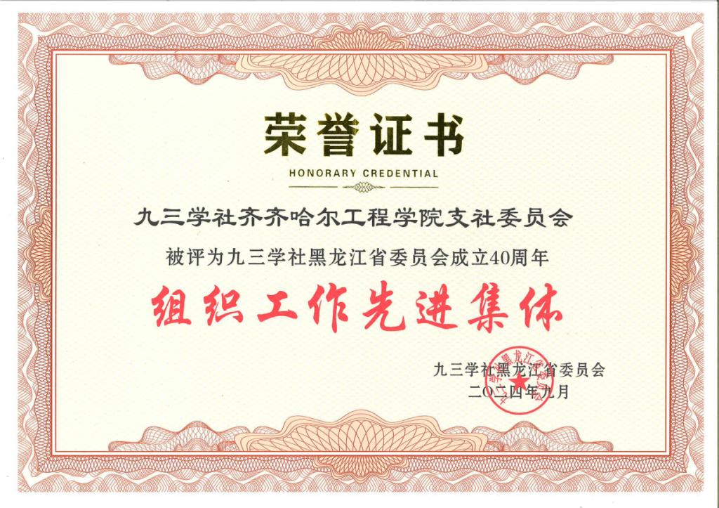 近日,为庆祝九三学社黑龙江省委员会成立40周年,激励全省各级社组织和广大社员为建设中国特色社会主义事业作出新贡献,九三学社黑龙江省委员会对2022年换届以来在组织工作、机关建设、宣传思想、社会服务、参政议政等方面表现突出的各级社组织、社员予以表彰。九三学社齐齐哈尔工程学院支社委员会被评为“组织工作先进集体”。郭玲玲被评为“组织工作先进个人”。郭玲玲结合实际教学工作,组织社员开展常态化学习,提高认识;...