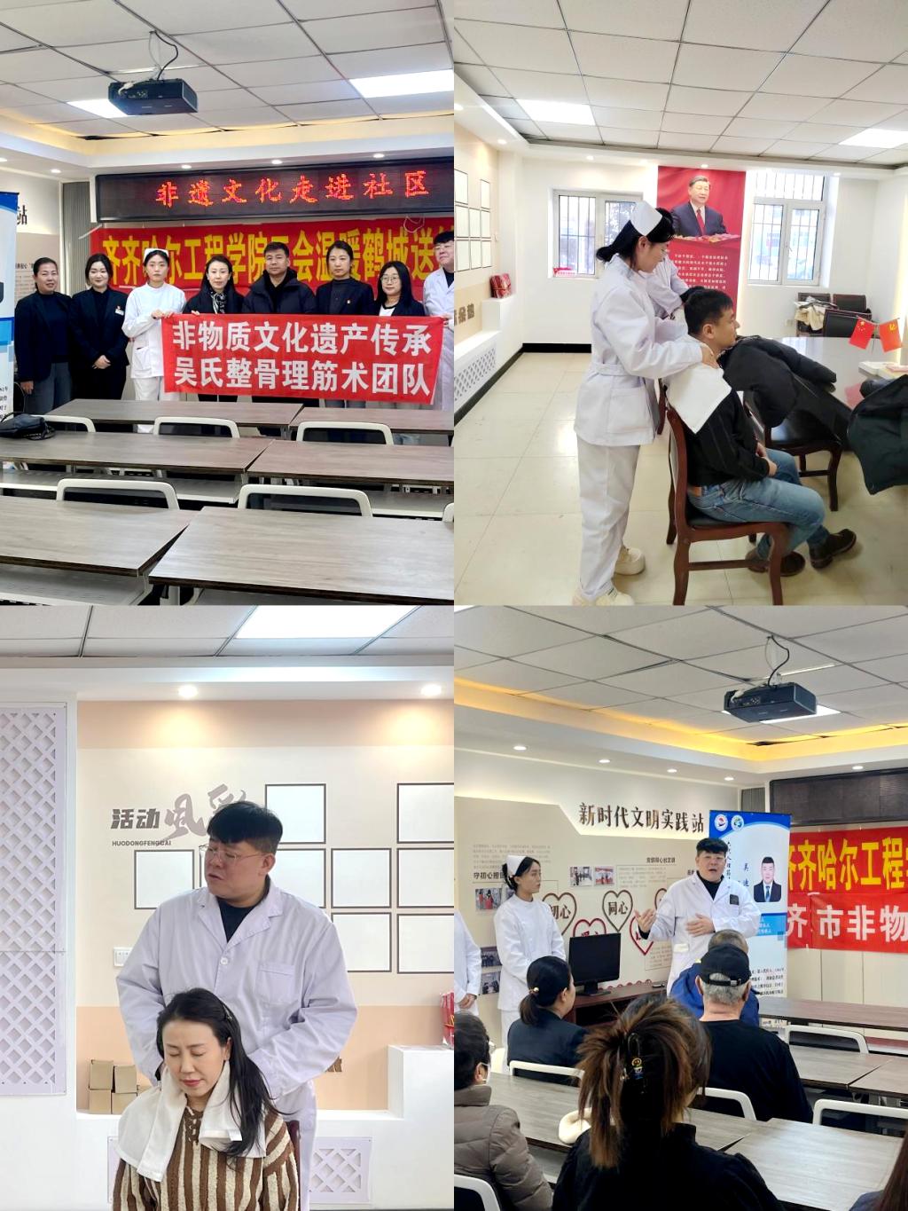 为贯彻落实习近平总书记关于社会工作的重要指示精神,更好的推进非物质文化遗产保护传承和造福社会,近日,学校工会联合龙沙区文旅局共同组织开展“温暖鹤城送健康”行动,非物质文化遗产传承项目理筋术传承人吴迪老师带领康护工程系学生走进社区为工作人员提供健康推拿服务。吴迪为社区工作人员讲解了冬季养生知识、非遗理筋术推拿的基本原理、常用手法及冬季适宜的推拿保健方法,并现场演示几种简单易学的非遗推拿手法。同学...