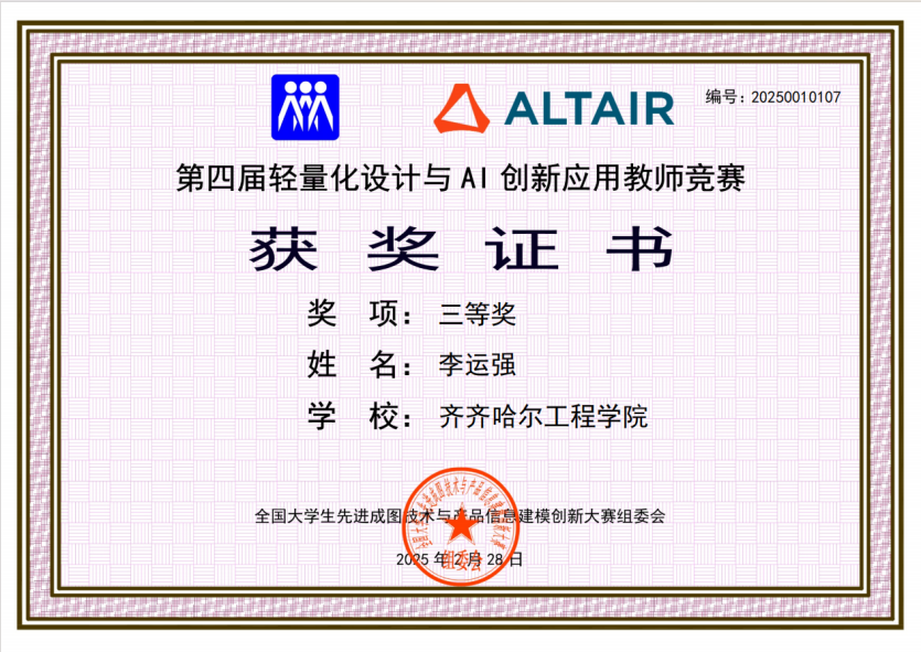 近日,全国第四届轻量化设计与AI创新应用教师竞赛传来喜讯,我校机电工程系机械专业教师李运强的无人机机架轻量化模型及AI数据优化获得国赛三等奖。随着人工智能技术AI的快速发展,AI的应用领域不断扩展,其在工程设计、仿真、制造等行业中扮演着越来越重要的角色。为了应对这一技术变革的浪潮,让AI融入机械产品结构轻量化设计中,同时培养AI应用方面的优秀教师,使教师掌握AI在专业领域的应用的重要能力,全国大学生先进成图...