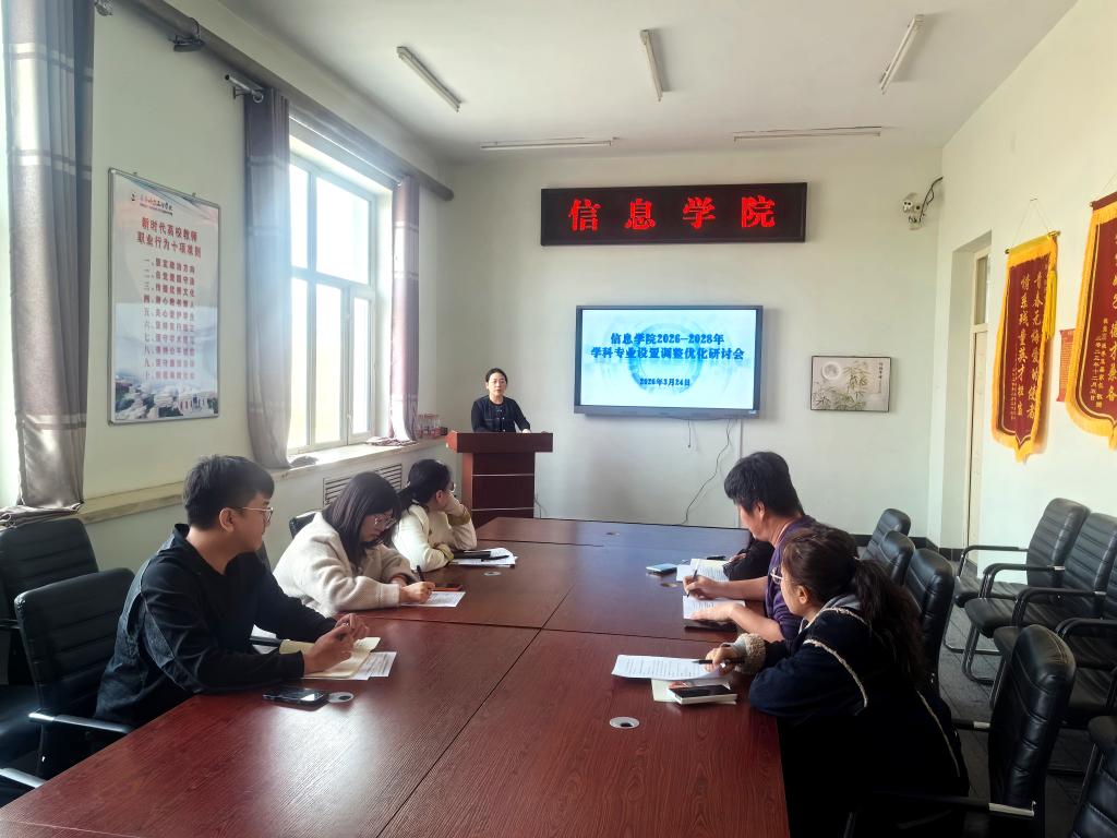 为深入贯彻落实我省高等教育学科专业设置调整优化工作的战略部署,主动对接区域产业发展需求,科学谋划未来三年专业建设方向,信息学院于3月24日上午在一号教学区2406会议室召开学科专业设置调整优化工作会议。会议由学院副院长刘春媛主持,学院院长郝丽娜及各专业负责人参加会议。会议聚焦学院2026-2028年学科专业设置调整优化工作,围绕推动专业内涵式发展、强化产教融合协同育人、构建特色鲜明的专业集群”等核心议题展开...
