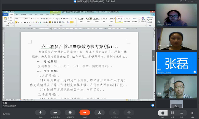 3月12日下午,资产管理处处长张磊利用钉钉平台召开部门新学期资产管理准备工作视频会。 会上,部门人员分别就《齐齐哈尔工程学院资产管理员考核办法(修订)》和《资产管理处绩效考核方案(修订)》中的考核形式、考...