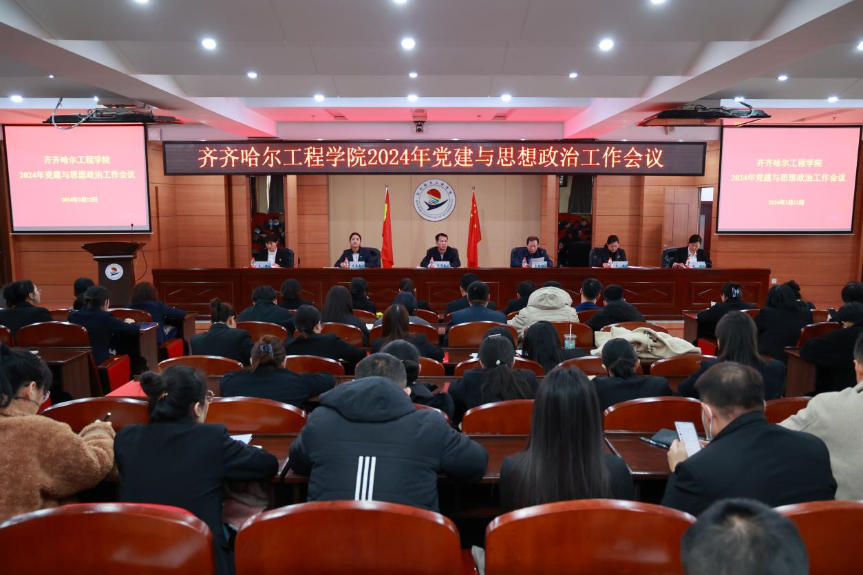 3月22日下午,学校党委在图书馆601报告厅召开2024年党建与思想政治工作会议,院长、党委副书记曹然彬主持会议。党委书记郭伟东出席并讲话,学校党委委员、党务工作者、马克思主义学院、工会办公室、学工处全体教职工、民主党派负责人及各部门领导干部参会。党委副书记、副院长陈景鑫宣读学校党委2024年党建工作要点。党委委员、副院长白雪宣读《齐齐哈尔工程学院思想政治工作五年规划(2023——2027)》。党委委员王丹宣读《齐...